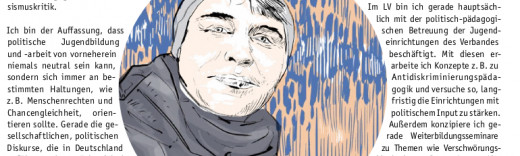 Im LV bin ich gerade hauptsächlich mit der politisch-pädagogischen Betreuung der Jugendeinrichtungen des Verbandes beschäftigt. Mit diesen erarbeite ich Konzepte z.B. zu Antidiskriminierungspädagogik und versuche so, langfristig die Einrichtungen mit politischem Input zu stärken. Außerdem konzipiere ich gerade Weiterbildungsseminare zu Themen wie Verschwörungsideologien, Corona-Leugner*innen oder Sexismus (zusammen mit Anne vom LV RLP).